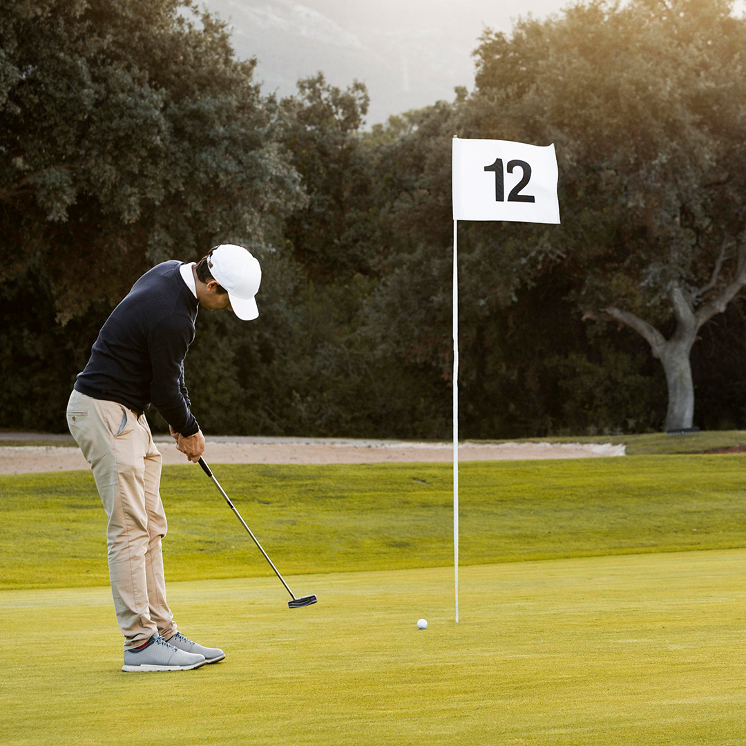 깃대는 녹색의 구멍에 위치한 꼭대기에 깃발이 있는 높은기둥입니다. 골퍼들은 다음 샷을 더 쉽게 하기 위해 가능한 한 핀에 가까운 공을 치는 것을 목표로 합니다.