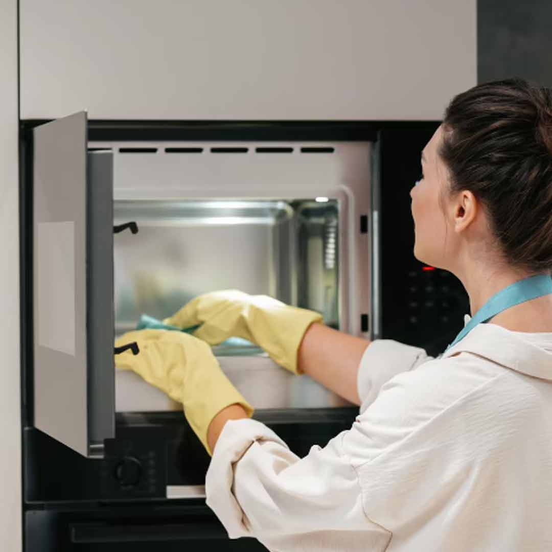 머그컵 등의 내열 용기에 분말 베이킹 소다 (큰 스푼 1)와 물 1컵을 넣고 섞어 전자레인지로 500W로 5분 정도 따뜻하게 합니다.  15분 정도 그대로 두었다가 닦아냅니다.