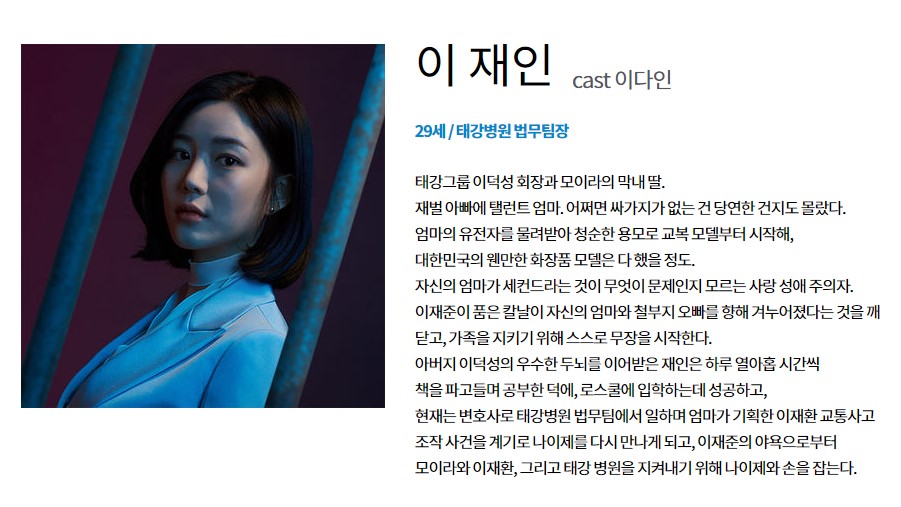 2019 KBS2 수목드라마 '닥터 프리즈너' 이재인 역(대기업 회장 딸이자 법무팀장)