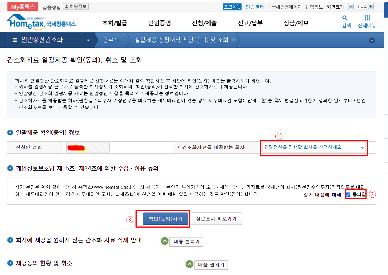 1. 공동인증서 등 로그인  -> 2. 자료제공 동의 신청   -> 3. 연말정산 자료조회