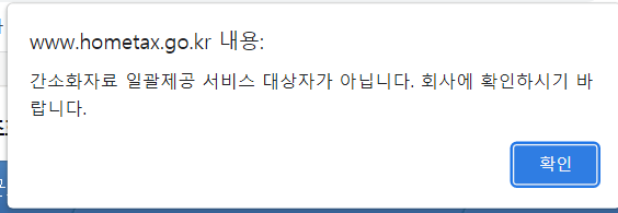 만약 연말정산 간소화 일괄제공동의를 클릭했을 때, 대상자가 아닌 경우에는 이러한 창이 뜨게 됩니다.